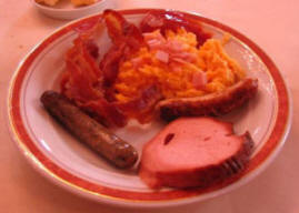 After getting into bed at 5:30 AM and woke up at 7:30 like it was a normal day. It was too early to do anything so I just lied around until Marcia got up for breakfast at 8:30. After she left I decided I had to try out this "free breakfast thing," so I got dressed and went down for a sit down meal. They were willing to cook two eggs over easy with toast and ham but 15 minutes later she returned with an open face sandwich of ham and eggs. It was good but difficult to eat by hand or knife and fork. I then tried the scrambled eggs with bacon, sausages and a slice of thick baloney and then finished with a bowl of mixed cereals and bread pudding with hot cherries. That and prune juice and a cappuccino made a good breakfast.