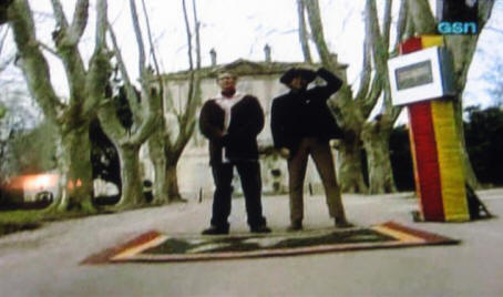 [I saw this watching the reruns of the show from a previous year when I got home. On the left is one team finishing a puzzle of the front of the Ch�teau (a challenge) and on the right is Phil and a local awaiting the race teams in front of the Ch�teau. Too bad we couldn't have stayed there.]
