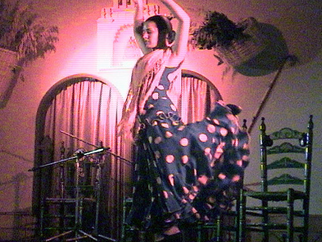 What an edifice both inside and out. To me, the spectacular thing was seeing Cristobal Colon's (Christopher Columbus') tomb. It was elevated in the air and held aloft by 4 iron pallbearers - very spectacular. Next door is the chapel of the Americas with flags of every nation in the new world. This is where Columbus prayed before leaving for his trip to India in 1492. There are 43 side alters here, more than any other church in the world and they are beautifully done and kept up. The central altar is really spectacular, all in gold, and the most amazing I have ever seen in all my travels. It is impossible to explain the effect of the size of this place and no photograph can relay it. We headed for the tower (Giraldo) and Marcia decided this is the only one she would go up because there are no stairs. You go up by walking slanted walkways to the top. The views of Sevilla were great. Marcia was very tired especially from the walk down and she was beginning to get a sore throat as well. I told her it was time for her to have a glass of wine so we stopped at a little place near the Cathedral. Before I sat down, I was approached by an Aussie, who asked if I was interested in a Flamenco show. Like a goof, I actually let him talk me into buying tickets to the "best flamenco show in Sevilla" for the 11:30 show (non-dinner show). Marcia asked me what the hell I did that for and I told her I trusted him. We finished our wine and headed out for a tapas crawl for dinner. The first place we stopped was an American TexMex place called the Lone Star where I enjoyed a Guinness and they had CNN on. From there we followed the guide book and went to the Bar Giraldo and had flamanquin and veal filet with rioja all of which was good. I tried a glass of sherry for the very last time. Next a little walk into the barrio Santa Cruz and went into the inviting La Guita where we had flamanquin and chorizo with rioja. Then a stroll to the Bar Las Teresas where Marcia had a spinach & garbanzo bean tapas with wine and I just had a beer. A couple from the UK invited us to join them at their table and we enjoyed chatting with them. We then negotiated many winding little streets to find another place recommended in the Cadogan book, the Casa Roman which is next to the Hostal Lucia (a nice place to stay - next time). We split a tortilla con jambon and we now know that tortilla means omelet in Spanish. It was by now 11:15 so we had to rush to find a cab which raced us up the hills to the Las Brujas for the flamenco show. As soon as I looked at the place I knew I had been had. Then it came to mind that Aussies are descendants of criminals. It was already 11:35 and the showroom was empty with no one prepared to put one on. The lady tells me the show will start in a few minutes as 8 people dash from the bar to head backstage to change. She took us to the showroom in the back and it was dark and totally devoid of people. Upon seeing this, I got this creepy feeling we had been scammed, since the show should have started 10 minutes ago. I told the woman strongly in no certain terms that I wanted my money back. She tries to calm me down by telling me the show will start shortly. I told her I didn�t want a show with just the two of us in the audience. Then after I pushed harder for my money, she explains that she doesn�t have the money, only the guy who sold me the tickets could refund me. I was highly irritated but we decided to while the gang in the bar changed in to their costumes. We waited 15 minutes and the show started with Marcia and I as the sole audience. We felt a little foolish so we didn�t sit in the front rows. I think the performers did also, in the beginning, but as they got going they really got into it. After awhile two elderly women entered and the audience doubled. The show lasted an hour and a half and they danced their hearts out for us. There was a singer, two guys playing guitars and a guy and four women dancers. I hate to admit it but we really loved it. It would have been even better if there had been others in the room. Oh well, we have nothing to compare it to, so we enjoyed it. We caught a cab back and got to bed at 3AM.