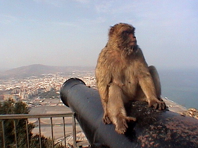 I sprang up early at 10:30 and by noon I headed out to conquer the Rock. I ran through the town to Casemates Square, exited the city gate, made a right at the BP station and all the way around the Rock to the other side. When I finally stopped and looked up at it, it was amazing. This huge white thing looming over me. It really was spectacular. After taking about a thousand 1000 photos, I headed back to town and joined Marcia for a cap at the same place as last night. I tried one at Casemates Square put it had a foot of whipped cream on it and I just wasn't in the mood, so I walked. Marcia and I walked the town and found the Internet cafe and sent off Chapter 33. It was like all of the internet cafes, very humid inside. We walk all the way back and found the taxi rank and bumped into Francis who offered us a tour for $50. We decided to take it rather than argue with him. It was actually very good. We climbed the side of the Rock itself and first reached St. Michael's Cave which was used as a hospital in WW II, now they have concerts in it. It was beautifully lit and worth the look. He then took us higher to where the Barbary tailless apes live. There are several colonies of these apes and they were believed to be brought here by the Moors. They exist nowhere else in all Europe and it is said that the British will leave when the last one dies. They take very good care of them, needless to say. We then went even higher for views of the whole island and to tour the Siege Tunnels, then back down past the Moorish Castle (now a prison) and the cable car to arrive at the very tip of Gibraltar to see the Shrine to Our Lady of Europe which has been there for over 500 years.