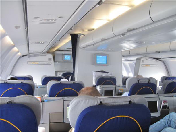 We got to the Business Class Lounge (below left) at 7:00 and at 7:30 I took my Klonopin 0.5 mg. We called the kids to let them know we were on our way. At 8:00 we boarded the plane which was a Lufthansa Airbus 340-600. You can see our carryon luggage (below right) is much less this time; Marcia's two bags are in the rear and mine in the forefront are two bags plus my computer bag holding two small Acer ($300) computers.