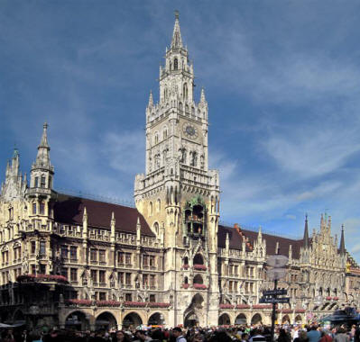 I got back to the hotel and changed and at 9:35 we walked a couple of blocks through Marienplatz. Here are two PhotoStitch shots of the Neues Rathaus which I have photograhed so many times. This time it is free of scaffolding.