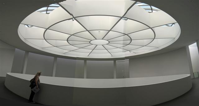 You can see there are many rooms to explore and we are getting a late start, as usual. We entered and took the elevator to the top floor and all we found there was this huge circular skylight which was quite impressive.