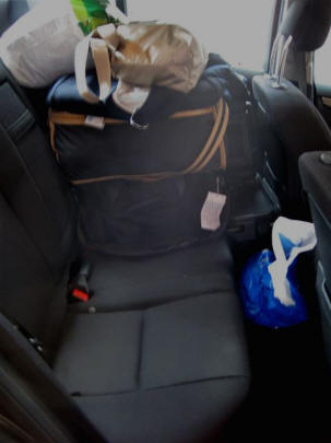 They overcharged me for two breakfasts (�30) I never had. We both went up and got our bags. At 3:15 we had a terrible time trying to get all our bags in this little trunk. John was very determined and after several different configurations he did his magic but it was still totally impossible, so we had to pile a bunch of them up in the middle of the back seat (below right.) Poor Marcia and Najwa had to squeeze in on each side. I had a bunch under my feet in the passenger side. It was rough.