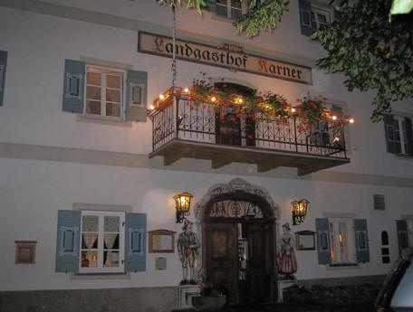 It certainly seems a charming place to stay. At 8:30 we sat down for dinner at their restaurant called Karner [Nussbaumstra�e 6, Frasdorf, +49-80-521-7970.] I took these shots of their indoor dining area.