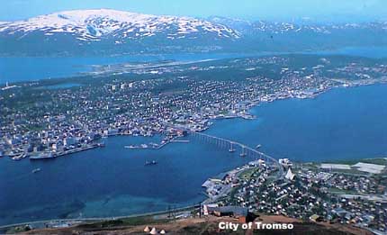 By 1 AM it was almost daylight again and time for us to go. Aleks called a cab for us and our ride back took us past the Arctic Ocean Cathedral (Ishavskatedralen,) which was designed by Jan Hovig in 1965 and over the beautiful suspension bridge (Troms�brua) back to our hotel. The gal on the night desk was nice and let me do AOL email while Marcia went up to bed. I was able to book my hotel reservations for the American Academy of Ophthalmology meeting in Anaheim in the fall. I finally got to bed at 3 AM.