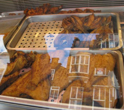 over looking the busy intersection (the last empty table in the place.) I