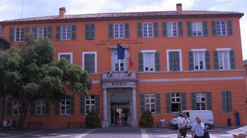 Fr�jus (pop 52,000) was the first city in Gaul (old France) founded by Julius Caesar when he marched in here in 49 BC and conquered it. As I approached the old town I found a stationary store open and went in and bought some markers to mark the map as we travel (I forgot to bring one with me.) I arrived in the center of town at 11:10 (which is semi-pi�tonne or semi-pedestrian - whatever that means) and saw the H�tel de Ville (city hall). I begin to notice that there are statues of Mary high up on many corners of buildings.