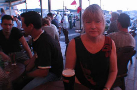 At 9:10 Marcia pointed out to me that there was an Irish Pub over to the right. I was really in the mood for a Guinness. We found a table out in front and we each had two Guinness and white wine at Kelly's Pub. Inside, the pub was really neat but it was too hot to sit inside. The scenery was great and it was lovely.