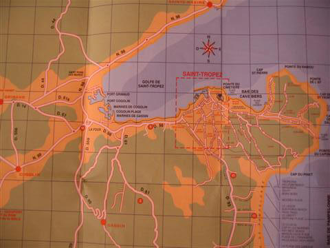 Marcia then drove the 22 miles along the coast to get to St. Tropez and as we approached the town, we could see that the traffic was totally nuts. St. Tropez sits on the north side of a peninsula and you have to drive all the way down one side of the bay and around the bend to get there (left map). The marina dominates the little town with its squeezed-in tiny streets (right map.)