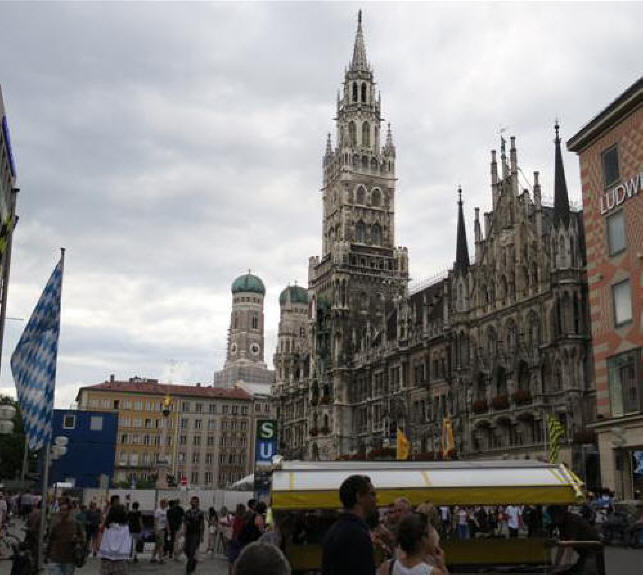 I went back to hotel and changed into my running gear and headed out toward the Hofgarten. I passed through Marienplatz (the center of Munich's Altstadt) and got these shots which beautifully show the Neues Stadthaus (New City Hall) (center steeple) and the Frauenkirche church (twin domes) in the background.