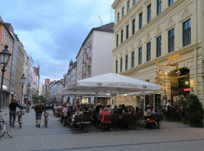 Once you pass through the gate, this is what Sendlinger Strasse looks like from the other side (below left). There is Kennedy's very large biergarten to the left of the bar (below right).