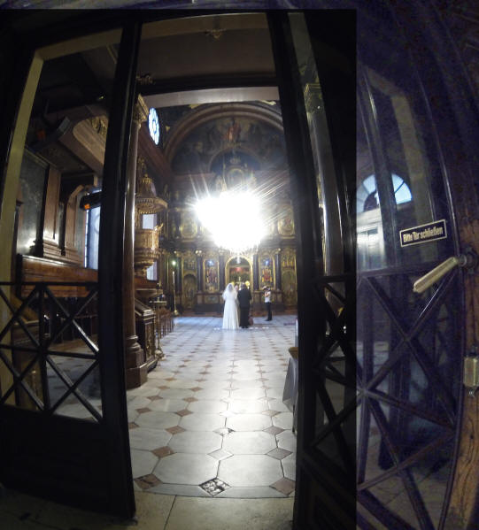 I snuck inside the church, just cracked the door open and peaked into the main altar room where a wedding was taking place and got this shot (below left) with my GoPro camera. I didn't dare enter the room, so I used the Canon to take three separate shots (one through each glass frame) to eliminate the door frames and PhotoStitched them to get this beautiful shot (below right).