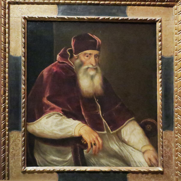 Titian did a number of paintings of this pope. Here is "Pope Paul III, Farnese" from 1546.