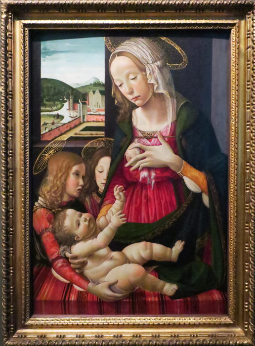 Below is titled "Mary with the Child and Two Angels" by Sebastiano Mainardi (1450-1513), done between 1475-1500 and acquired in 1662.