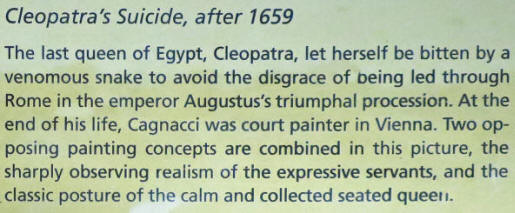 The painting in the above left is titled "Cleopatra's Suicide" from 1659 by Guido Cagnacci (1601-63) who worked in Emiligio Romano, Rome and Vienna. This is my shot of it, his most famous piece and ....