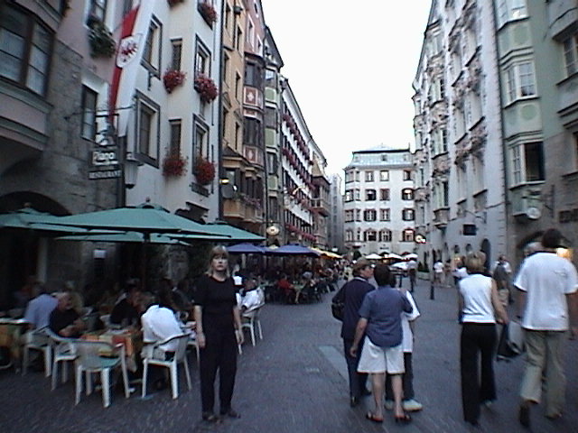 Up and at'em in the AM and catch a cab to the new BMW facility, go through the paper process and drive out with the new BMW. We decide to head directly to Innsbruck [bruck=bridge, over river Inn] and got a room at the same hotel (Alpotel-Tirol) we stayed at last time. Did my run through the main downtown area which was very quiet and then to the old part of town and discovered there was a public concert starting of traditional �sterreich music by a large Austrian orchestra dressed in traditional garb. I ran back to the hotel to get Marcia and we got back in time to hear most of it. After strolling around the altstadt for a while we returned to the Goldenes Dachl (Golden Roof) where we again enjoyed the best Hungarian goulash and typical Austrian fare (worsts & pork with sauerkraut and mustard). A nice change from pasta everyday. This is a beautiful little city that you could spend a week or more in.