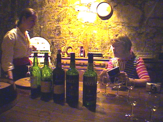 How this all got started was during the war between England and France, wine sales from France were cut off, so industrious English businessmen came to Portugal and pushed heavy wine production. Here they gave us the opportunity to sample six different ports from white to tawny to red. Most were very good. We left there and walked down one block and found the door to the Osborne we were looking for. They gave us a similar tour and a couple of samples. Good thing we weren't driving any place. There we met Donna Harvey, a lawyer from Santa Monica, who is now working in the southern tip of Texas. The three of us left there and walked down the huge hill to the river front and had some coffee. We then brought her with us by cab back across the bridge. Since we ate in a fleabag last night we had made a reservation at the fanciest restaurant in Porto called Portucale. We caught a cab there which was way out in the high rent district we were told. But to me it looked just as bad as everything else in Porto. There are practically no green areas in this city. Here we had an upscale dinner looking out over the skyline from 13 floors up (still didn't look nice.) I tried stewed Kid (goat) again and this time it was very good (even with all the bones). We got a cab back and I was looking forward to getting the H out of this place.
