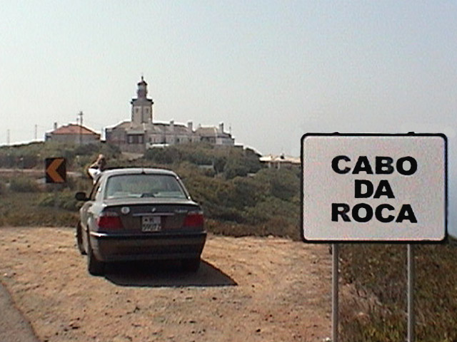 I woke up at 7:30 AM. Today we drive to the capitol, Lisboa, so I want to see a few more sights here, since this is where the kings and the royalty hung out. At 11 AM I drove over to the National Palace of Sintra which is located in the center of the town and toured the inside (It has two huge conical chimneys built by the Moors). They didn't allow pictures inside of either of these castles, but I got some video of this one. I drove back to the hotel to check out and pick up Marcia. I dropped her off in town for some shopping while I drove up to the fortress (photos) built on the mountain just below the Castle de Pena. I park the car in the lot and then there is a 1 Km walk in the woods (which was beautiful) just to get to the main gate. I buy my ticket and then there is another long climb to get to the ruined fort. It is spectacular but Marcia owes me one for not bringing her on this grueling exercise. I do the 15 min trek back to the car after crawling over most of the fort, pick Marcia up in town and she drives south then west then northwest to the lighthouse (faro) at Cabo da Roca.
