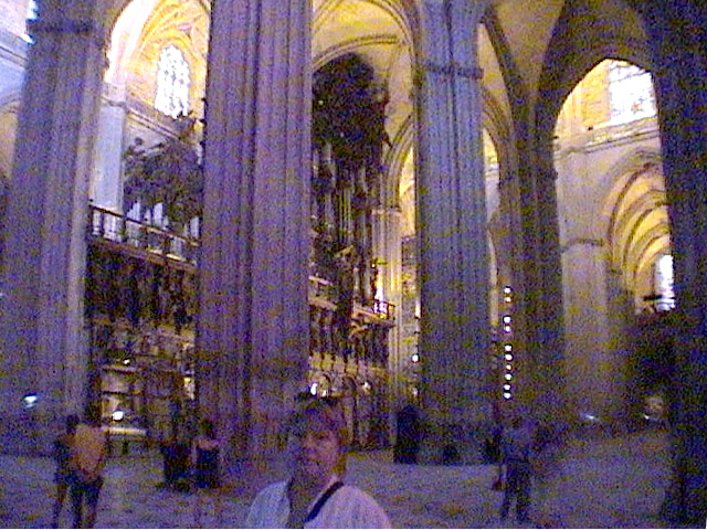 Woke at 9:30 and went out to run at 11:30. I expected it to get hot here as well but it was slightly overcast with a nice breeze. The streets here are very large and busy so I decided I had better run in the little park next door called Jardins de Catrina. The soft dirt was good on my knees. I finally maneuvered my way through the streets and found the major thing here, the Cathedral of Sevilla, which is larger than that of Milano and only second to St. Peter's. They claim it is the largest cathedral in the world. It took me quite a while to walk around it and photograph it. The tower attached is called the Giralda because of the weather vane at the top. It was originally a Moorish minaret. I left there and started hunting for an internet cafe and was led to the Alfalfa 10 cafe which again wouldn't allow use of a floppy so I kept looking. After wandering through the really wonderful streets covered with linens to keep the sun out, I arrived in Plaza Nueva covered in marble. At one corner is the Hotel Ingleterra and they pointed me in the right direction to a real good place Netsk@fe so I wouldn't have to hike all the way across the river to Tequila Connection. I enjoyed my cortado (getting used to them now) while doing email. Got a lot done and caught a cab back to the hotel. Marcia was just finishing her lunch in the hotel (Ouch$$!!) and after changing we headed for the Cathedral to tour the inside. We took a cab the 4 blocks because it was already 4PM and it closes at 5.