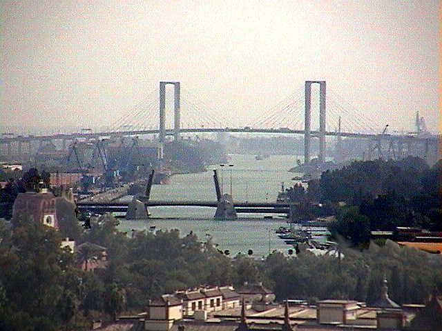What an edifice both inside and out. To me, the spectacular thing was seeing Cristobal Colon's (Christopher Columbus') tomb. It was elevated in the air and held aloft by 4 iron pallbearers - very spectacular. Next door is the chapel of the Americas with flags of every nation in the new world. This is where Columbus prayed before leaving for his trip to India in 1492. There are 43 side alters here, more than any other church in the world and they are beautifully done and kept up. The central altar is really spectacular, all in gold, and the most amazing I have ever seen in all my travels. It is impossible to explain the effect of the size of this place and no photograph can relay it. We headed for the tower (Giraldo) and Marcia decided this is the only one she would go up because there are no stairs. You go up by walking slanted walkways to the top. The views of Sevilla were great. Marcia was very tired especially from the walk down and she was beginning to get a sore throat as well. I told her it was time for her to have a glass of wine so we stopped at a little place near the Cathedral. Before I sat down, I was approached by an Aussie, who asked if I was interested in a Flamenco show. Like a goof, I actually let him talk me into buying tickets to the "best flamenco show in Sevilla" for the 11:30 show (non-dinner show). Marcia asked me what the hell I did that for and I told her I trusted him. We finished our wine and headed out for a tapas crawl for dinner. The first place we stopped was an American TexMex place called the Lone Star where I enjoyed a Guinness and they had CNN on. From there we followed the guide book and went to the Bar Giraldo and had flamanquin and veal filet with rioja all of which was good. I tried a glass of sherry for the very last time. Next a little walk into the barrio Santa Cruz and went into the inviting La Guita where we had flamanquin and chorizo with rioja. Then a stroll to the Bar Las Teresas where Marcia had a spinach & garbanzo bean tapas with wine and I just had a beer. A couple from the UK invited us to join them at their table and we enjoyed chatting with them. We then negotiated many winding little streets to find another place recommended in the Cadogan book, the Casa Roman which is next to the Hostal Lucia (a nice place to stay - next time). We split a tortilla con jambon and we now know that tortilla means omelet in Spanish. It was by now 11:15 so we had to rush to find a cab which raced us up the hills to the Las Brujas for the flamenco show. As soon as I looked at the place I knew I had been had. Then it came to mind that Aussies are descendants of criminals. It was already 11:35 and the showroom was empty with no one prepared to put one on. The lady tells me the show will start in a few minutes as 8 people dash from the bar to head backstage to change. She took us to the showroom in the back and it was dark and totally devoid of people. Upon seeing this, I got this creepy feeling we had been scammed, since the show should have started 10 minutes ago. I told the woman strongly in no certain terms that I wanted my money back. She tries to calm me down by telling me the show will start shortly. I told her I didn�t want a show with just the two of us in the audience. Then after I pushed harder for my money, she explains that she doesn�t have the money, only the guy who sold me the tickets could refund me. I was highly irritated but we decided to while the gang in the bar changed in to their costumes. We waited 15 minutes and the show started with Marcia and I as the sole audience. We felt a little foolish so we didn�t sit in the front rows. I think the performers did also, in the beginning, but as they got going they really got into it. After awhile two elderly women entered and the audience doubled. The show lasted an hour and a half and they danced their hearts out for us. There was a singer, two guys playing guitars and a guy and four women dancers. I hate to admit it but we really loved it. It would have been even better if there had been others in the room. Oh well, we have nothing to compare it to, so we enjoyed it. We caught a cab back and got to bed at 3AM.