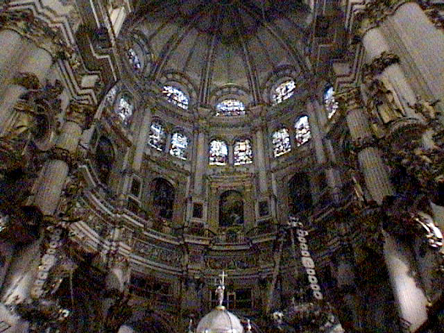 Because we had to get a ticket early, Marcia woke me up at 7:30 and I was dying. I climbed out of the hotel and caught the 1st cab for the two minute ride up to the gate. I went to the back of the line at 8:30 and after 20 minutes I had my ticket to enter the Palace at 10:30. I took a cab back to the hotel and had a cappuccino and put my running clothes on under regular clothes. The day was slightly overcast and partly cloudy but the rains were over. I took a cab back up again at 9:30 and headed straight for the Palace. They let me in at 10:15 and I toured this magnificent example of Moorish buildings in Spain. The designs were really incredible. The path led me outside and I walked further up the hill to see the great gardens called the Gereralife (ghen-er-al-lee-feh). After walking all through that it was almost noon and time to find the chapel in the Alhambra where they had a Mass. I actually got there early and was there for the beginning of the Mass. After Mass I found the Parador within the walls of the Alhambra which was converted from a Franciscan monastery. I found the cafe and relaxed with a cappuccino and a crossword puzzle for an hour before tackling the rest of this huge place. I then went to tour the Fort called the jam�n Alcabaca and then the Palace of King Carlos V. Marcia had signed up for a tour of the whole place from 10 to 1 while I did it on my own (tours bore me to death). I caught a cab back to the hotel and worked on my photos. We checked out of the hotel at 4 PM and then I went for my run back down the hill to the Catedral area and I found an Internet cafe to send email Diario #35. A cab back to the hotel and it was time to leave this great city of Andaluc�a.