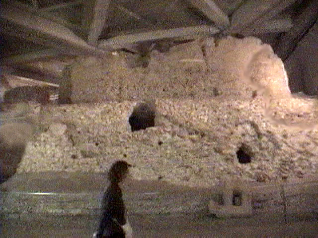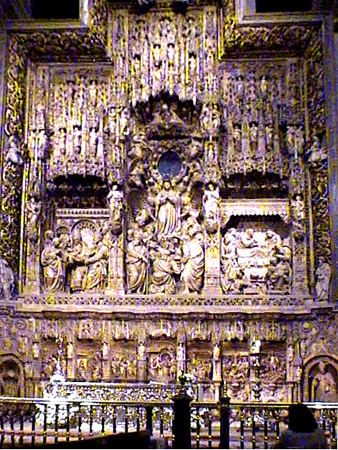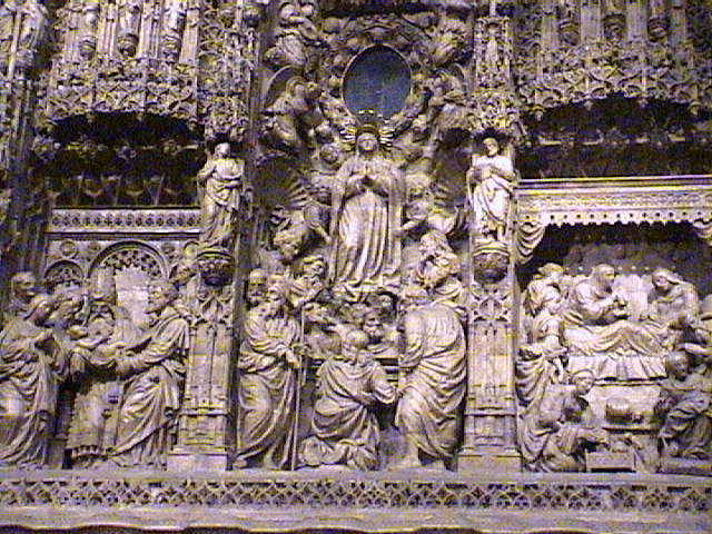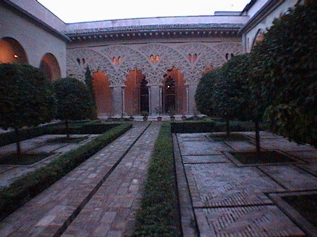 Marcia drove the 112 miles southeast to the Capitol of Aragon, Zaragoza (thairrr-ah-go-thah). This is the city Dr. Hoyos went to medical school in and where his wife Maite is from; one of the reasons I wanted to see it. Many people told us there isn't much to see in this city of 600,000 people and we could skip it but am I glad we didn't. It is one of the nicest cities in Spain as I will explain. It took 2 hours to get there and we checked into the Hotel Meli� Zaragoza on Avd CaesarAugusto at 5:45. The name Zaragoza comes from a corruption of its original Roman name Caesar Agusto. Say it fast a couple of times (with a lisp). We parked in the garage downstairs and after unpacking, I went down to the desk to find out about Internet and closing times for places we wanted to see. Some pretty tour girls were nearby and they told me that the Aljafer�a Palacio (I wanted to see and thought was miles out of town) was quite near in the city and open until 7 PM. The desk told me that there was an internet joint around the block at the back of the hotel so I ran over quick and went inside. What a place. There must have been 40 computers packed into this tiny place and there was a teenager on each one playing some video game and they were yelling and hooting. I asked the kid if I could get online and thankfully he took me to the back with one open computer. I got on quickly and it is worked like a zip sending out Chapter 44. I signed off and tried to find the same kid to pay him and there didn't seem to be anyone in authority in this zoo so I just took off figuring I would be back later or tomorrow and pay somebody. I dashed back to the hotel room so we could get to the Palacio in time but Marcia had other plans. We caught a cab and it didn't take too long to get there. It looked beautiful in the late evening and even better when we left with all the lights on it. The Palacio de la Aljafer�a was originally built by the Moors in the 800�s and after the Reconquest, Fernando y Isabel couldn't resist using it for a palace. The musallah (an intimate mosque) on the first floor was astounding and beautifully preserved. It looked as good if not better than the Alhambra in Granada and the Mesquite in Cordoba. As it turned out they didn't close until 8 PM so we got to see the whole place and it was all lit up beautifully when we left. We walked for a little while and then caught a cab and took the 2 mile ride to the Plaza del Nuestra Senora El Pilar in the center of the old city. This long name comes from �Our Lady of the Pillar� and this is the second greatest pilgrimage site in Spain alter Santiago de Compostela. The story goes that Mary gave St. James (or vice versa) this pillar to build a basilica in Zaragoza. A statue of the Virgin sits atop the pillar and the mantra (small cloth covering) is changed everyday. Now, as a Catholic, I have a hard time with this one also, but, to be fair, maybe I didn't get the whole store straight because I was very impressed by the devotion of the people to this pillar. The Plaza is very large and flanked on two ends by the Basilica Pilar and the Catedral de Seo al Salvador. In between them are the Ayuntamiento (remember, City Hall) and the Lonja building. Near the Catedral is an erected covering for the excavations of the Roman Forum and Marketplace that was found underground during excavation several years ago. There was a line in front of the Lonja entrance, so we queued up (habit from our UK trip). The exhibit they had inside was free and was about art and expression regarding the unionism movement and the poor and downtrodden. We saw many excellent paintings and even a model of the human eye dating back to the 1700�s.