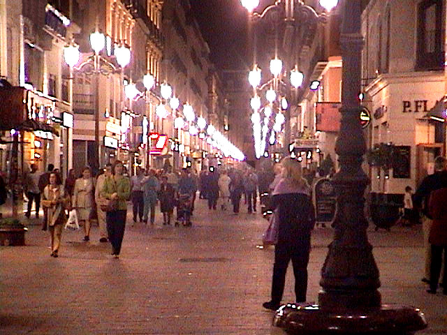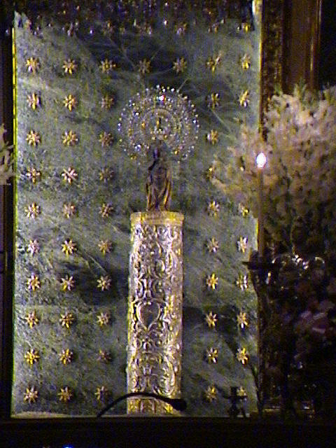 They were watching me like a hawk so I only got some video not good enough for photos. We were there for a half hour and when we got outside we walked to the front of the Basilica to see what this large greenish pyramid was. I asked a Spaniard who told me (in Spanish) that last week was the Feast of Nuestra Senora El Pilar and they build this pyramid of flowers for the festa. We went inside the basilica and I was floored by the difference in this church from all the others we have visited in Spain, Italy and the UK. All the huge original doors were wide open and anyone could go in or out any of them. The place was crawling with people walking around, praying, and visiting devotional chapels. It was like this church really meant something to the people and it was a big part of their lives. This was serious and quite different from what I have seen anywhere else. I gravitated to a central chapel covered in beautiful marble and after a few minutes my eyes focused in on why all the people were there; I saw the Virgin statue on the pillar. When I zoomed the camera in, I could not see any mantra on the statue so maybe it is taken off during the feast days. It is a major thing to go behind the chapel where there is a small opening where you kiss the back of the pillar. I waited in line with the rest and touched it. I walked the rest of this beautiful church and saw the altar piece and the large interior domes. It was a very comfortable place to visit and we were in no hurry. They had a Mass at 9 PM so I caught the last half of it while Marcia enjoyed a rioja at Bar Santiago in the Plaza and then I joined her for one. Around the corner we found the main pedestrian street (similar to the Santa Monica Promenade) that had just been finished and opened up last month. It was very nice with brand new street lamps, etc and a lively crowd. About a block up we wandered into Flanagan's Pub because it had a big Guinness sign outside. Alter a Guinness and rioja we decided maybe we would try the �Mexican Menu� they had and ordered cheese nachos, pollo wraps, potato with quesa and chili con carni as well as pollo alitas (chicken wings). It was all pretty good and a change from the typical Spanish fare we had been eating. The whole thing cost 5200 pesetas ($25). Alter dinner we walked the �promenade� just as we do at home and then had Irish coffees at Gran Bar Zaragoza, a pretty neat place that seemed like the 1880�s. From there we walked to the Roman wall and then caught a cab back to the hotel. Marcia went to bed while I took the computer to the bar and had a cappuccino and did some photos. I got to bed at 3:30 AM.