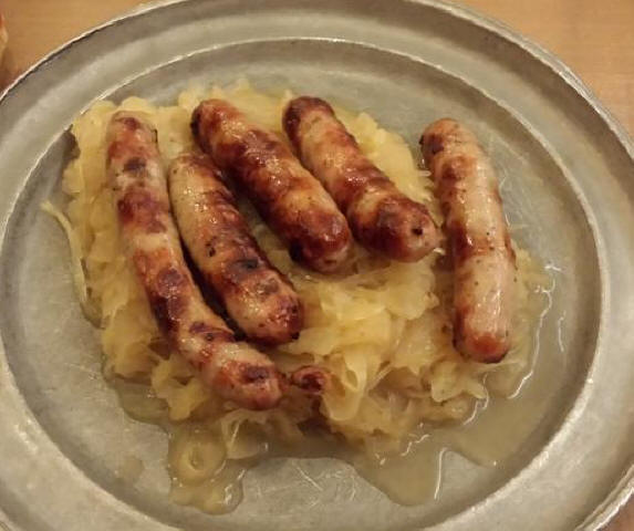... they serve their Hacker-Pschorr bier in nice ice cold glasses from the freezer. Their menu is extensive but I always go for my favorites. I started with my Nuremburger bratwurst with sauerkraut and mustard.