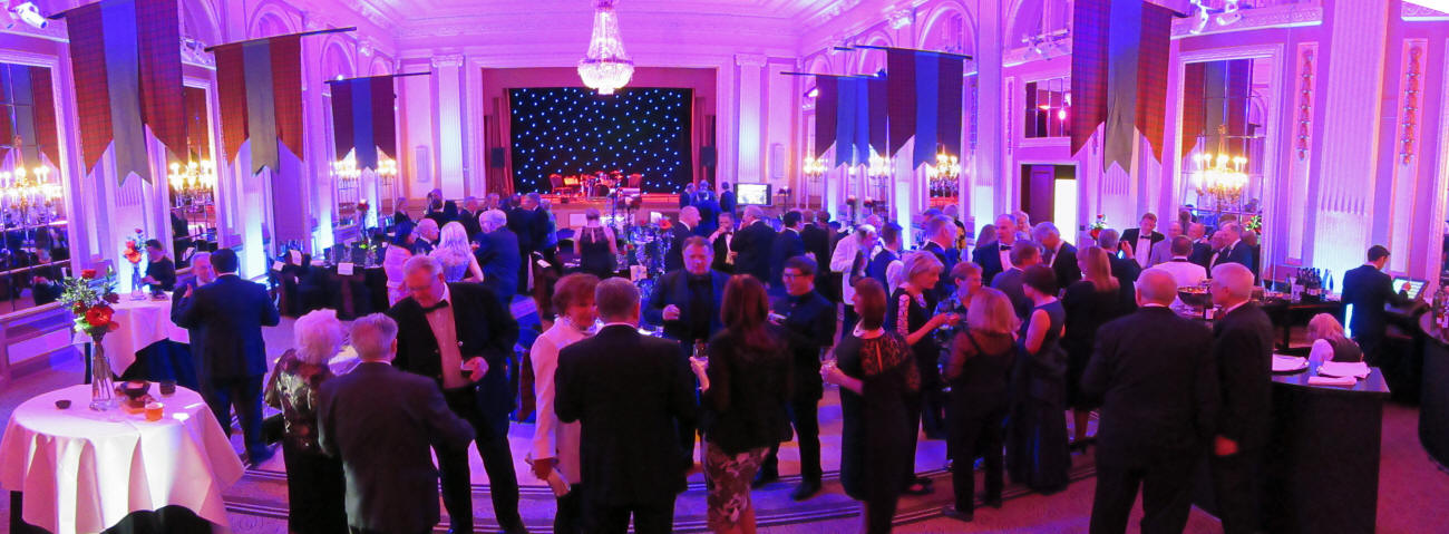 After the meeting ended, I drove back to the B&B to change and get Marcia. Tonight is the big black-tie optional final Gala Dinner. Since I have no room to pack a tux for a one night event while traveling in the EU for three months, I got into my usual dark blue sports jacket which is the only one I have ever worn in the EU for the past twenty years (even for my son's wedding at the Vatican in Rome in 2007). Dr. Barrett begged me to wear this special Scottish bow tie which I did even though I can't remember the last time I wore one. When we arrived the staff was handing out your beverage of choice as you enter the grand hall.