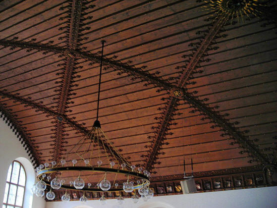 The first documented mention of this building was in 1310. Below left is the beautifully restored clock on the tower. The Grand Hall (Gro�er Saal,) constructed in 1392-4 (below right,) is noted for its intricately beamed ceiling and was the venue for the speech by Joseph G�bbels on November 9th, 1938 which was the prelude for Kristallnacht.