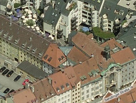 I discussed them in the Germany Diarios. The courtyard is amongst the umbrellas (below left and right.) The Asamhaus (Asam House) referred to (built in 1733) is to the left of the church (below right) on Sendlinger Stra�e.