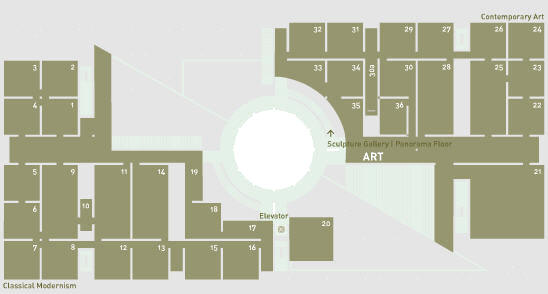 Above left is the exterior of the museum with an aerial view (above right) showing the Rotunda and below are the various floor plans.