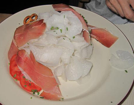 We ordered a bottle of Gr�nes Veltliner wine for dinner and then Ralph ordered something I had not seen before. It was Speck mit radishes (ham with thinly shaved white radishes) (below left.)