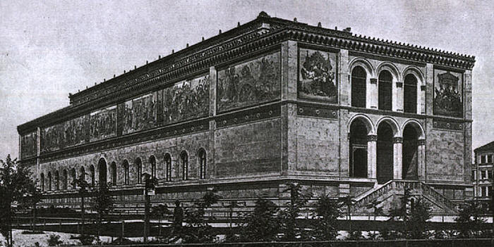 The Haus der Kunst (House of Art) [1 Prinzregentenstra�e] was constructed from 1934-7 by the architect Paul Ludwig Troost, as the Third Reich's first monumental structure of Nazi architecture and as Nazi propaganda. The "Tag der deutschen Kunst" ("Day of German Art") celebration showing Adolf Hitler, Hermann G�ring, Joseph Goebbels, Heinrich Himmler, Albert Speer, Robert Ley, Reinhard Heydrich is available on VHS and DVD. Below is a winter time photo I found which shows the columns of the building since the tree leaves don't cover them up.