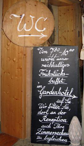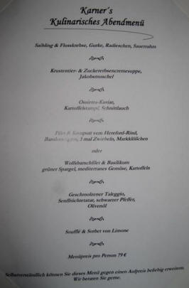 It certainly seems a charming place to stay. At 8:30 we sat down for dinner at their restaurant called Karner [Nussbaumstra�e 6, Frasdorf, +49-80-521-7970.] I took these shots of their indoor dining area.