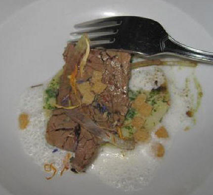 I got a little caught up in conversation and slipped a little when it came time to photograph all that we ate. I don't even remember which photo is of what. I had something with scallops (Krustentier und Zuckerbsencremsuppe Jacopsmuscel) followed by lamb's knuckle with bratwurst (Lammhaxe und bratwurst Kr�terjus Schnippelbohnen Tomaten Olivenstampf) (below right.) I should have paid more attention but the company was just too good.