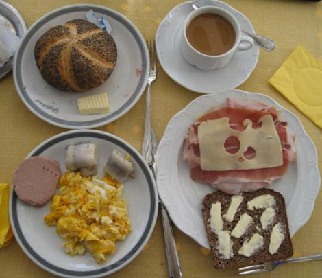 At 9:40, I got a table on the patio and got my breakfast. It was the usual buffet-style breakfast and I had Petrusquelle bubbly water, coffee, a Kaiser roll, scrambled eggs with liverwurst and a sandwich of ham and cheese on dark rye bread. It was pretty good.