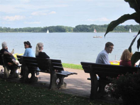 At 2:20 Marcia went to a local Apotheke and then we got back to the car. At 3:10 I drove us back to the hotel. We got back and waited for John's ship to arrive. Marcia relaxed on a bench and enjoyed the wonderful scenery. Finally their boat came in (below right) so we headed back to the car.