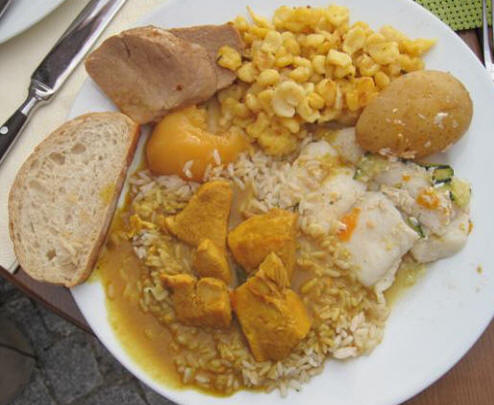 At 6:30 we went inside to get our buffet dinner and sat outside and enjoyed it. I had cucumber salad followed by a large plate of almost everything: pork filets with potatoes, chicken curry on rice, lachsfilet (fish,) boiled potato and cheese spaetzle (below left.) Marcia had pork filets, chicken curry on rice, salmon, and a little cheese spaetzle (below right.) Her plate was a little smaller than mine.
