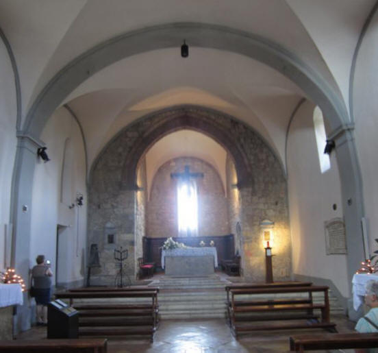 The church was consecrated sometime between the building of the defensive walls (1213) and 1235, when the peace treaty between Siena, Florence, and Poggibonsi was signed here. Santa Maria Assunta's association with pilgrims tracing the Via Francigena route (see below) continues to this day. There is a notice on the door offering lodging assistance to pilgrims. The tourist information office is on the left. Here are the views inside the chiesa (Canon left, GoPro right.)