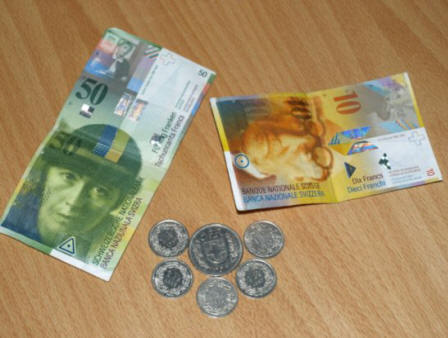 It was great, but not the best Wienerschnitzle we have ever had. For dessert, Marcia had a chocolate mousse and a glass of 1858 Port. Our dinner wasn't cheap (250 CHF = $115/each.) Below is a stock photo of Swiss francs (CHF): a 50 and 10 note and the various coins.
