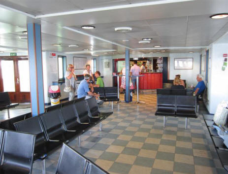 The ramp is lowered and you drive the car onto the boat deck (below) directed by the staff. You get out of the car and cliimb some stairs to the passenger area where there is a snack bar (below right.)