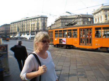 I woke up at 7:15 AM and then slept until 2:30 PM finally getting up at 3:00. I worked on the website for a little while and by 4:45 we were on our way to downtown Milano and would never have made it without the GPS system. This new GPS has the same woman's voice we have been used to but it projects the map in a new 3-D perspective that is quite nice. It still makes the occasional mistakes so you have to look at the signs as well. While driving to the Duomo (cathedral) I noticed that the SONY Vaio computer screen had developed a vertical thick red line 3/4ths the way up the center. Then a green line appeared on the left of it and the screen seemed to flicker. I shut it down hoping it was a software problem but I had a horrible feeling it wasn't. We drove around and finally found a parking spot and I put the computer in the trunk. We walked past the Duomo which is now totally covered in scaffolding.