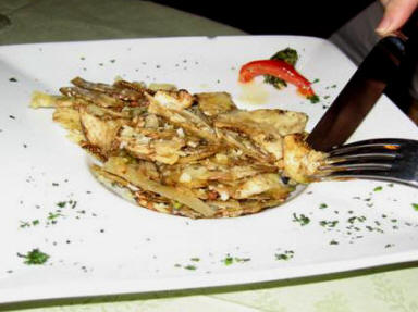 We were finally seated and the place was still humming as the midnight hour approached meaning our "short wait" was about an hour and a half. We had water with gas, and after all that champagne, we decided on only a � bottle of Tropez wine. Because of the long wait, they gave us a free order of fried zucchini flowers, something that sounds terrible but is absolutely wonderful. First time I had them was in the Jewish quarter in Rome in 1997. If they are on the menu, always say yes.