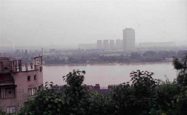 From this position, I took a photo across the river. The tall building in the distance (above right) is the U�će [Oosh-cheh] Tower (meaning "confluence.") Built in 1964, it overlooks the confluence of the Danube and Sava rivers. It was originally XXX ft (105 m) tall and houses the headquarters of the Central Committee of the League of Communists of Yugoslavia (Komunist Central Komitee or CK building.)