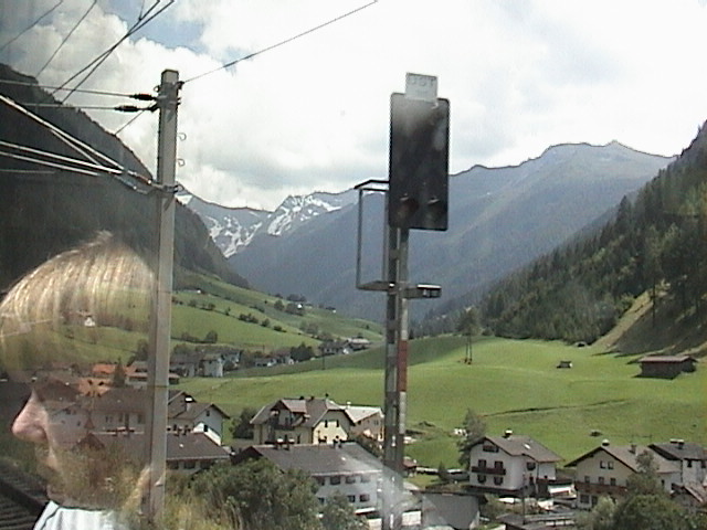 We got up early at 7:30 AM to pack and check out of the hotel. I discover that my 3 phone calls to Santa Monica for emailing using AOL have cost me over $150 over past 3 days just to get and send email. I will wait until I can connect directly to AOL here in Europe. We took a taxi to the Milano train station (ferrovia stazione). As usual it was an exercise getting all our bags in and out of the cab and on to the train. As is true of most all European trains we have taken, there is no one to tell you where your train is or when to get on. You fend for yourself and lug all your bags onto the train since there are no redcaps to help you on board or show you where your room is, even if you are first class and paying the highest fare. The two of us struggled to get these huge bags through the corridors of the cars since we got on near the end of the train and had to wend our way through 13 cars to finally find our room. Our room is intended to hold 6 people, 3 facing 3 on long bench seats with bags in racks above. So you have to negotiate lifting all the bags yourself while others sit and watch you struggle. The elderly German couple just scowled at me, probably because they wondered why I needed so many bags. Of course this arrangement leaves little privacy except that the door to the 6-man room closes. We experienced the same during our train trips from Paris to Munich in 1997 and again in 1999, our round trip from Milano to Lucerne, Switzerland in 1997 and the Chunnel train from London to Paris in 1999. No matter how high you pay, you hoof your own bags and get no privacy. Give me Amtrak service any day.