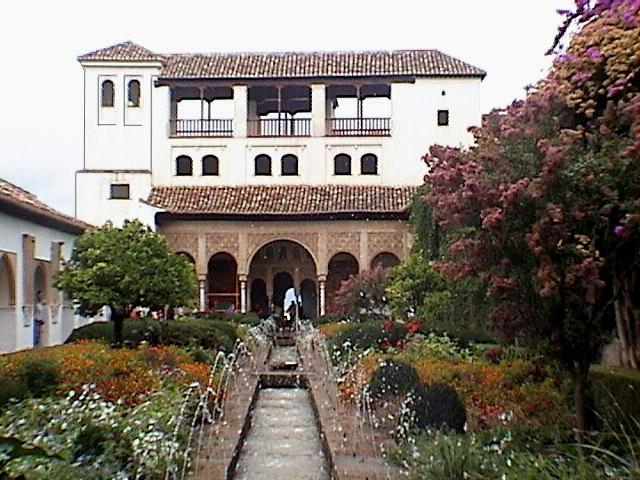 Because we had to get a ticket early, Marcia woke me up at 7:30 and I was dying. I climbed out of the hotel and caught the 1st cab for the two minute ride up to the gate. I went to the back of the line at 8:30 and after 20 minutes I had my ticket to enter the Palace at 10:30. I took a cab back to the hotel and had a cappuccino and put my running clothes on under regular clothes. The day was slightly overcast and partly cloudy but the rains were over. I took a cab back up again at 9:30 and headed straight for the Palace. They let me in at 10:15 and I toured this magnificent example of Moorish buildings in Spain. The designs were really incredible. The path led me outside and I walked further up the hill to see the great gardens called the Gereralife (ghen-er-al-lee-feh). After walking all through that it was almost noon and time to find the chapel in the Alhambra where they had a Mass. I actually got there early and was there for the beginning of the Mass. After Mass I found the Parador within the walls of the Alhambra which was converted from a Franciscan monastery. I found the cafe and relaxed with a cappuccino and a crossword puzzle for an hour before tackling the rest of this huge place. I then went to tour the Fort called the jam�n Alcabaca and then the Palace of King Carlos V. Marcia had signed up for a tour of the whole place from 10 to 1 while I did it on my own (tours bore me to death). I caught a cab back to the hotel and worked on my photos. We checked out of the hotel at 4 PM and then I went for my run back down the hill to the Catedral area and I found an Internet cafe to send email Diario #35. A cab back to the hotel and it was time to leave this great city of Andaluc�a.