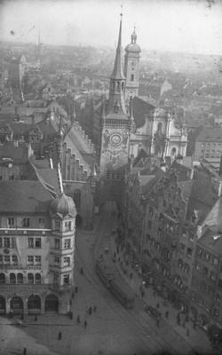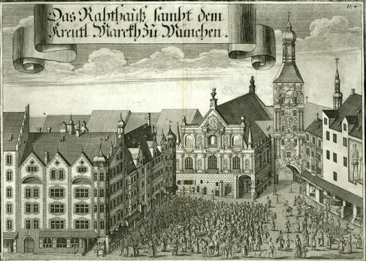 I got this shot (above right) of the Altes Rathaus [15 Marienplatz,] the Old Town Hall, which serves today as a building for the Munich city council. It bounds the central square Marienplatz on its east side (below.)