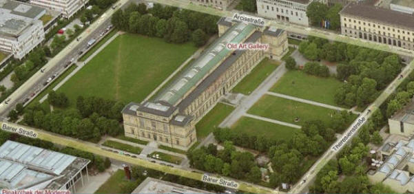 Above is another shot of the Residenz building alongside the park. When I was finished, I then headed up Brienner Stra�e to get to see the last big museum on my list, the Alte (Old) Pinakothek. Below is the Bing map (left) and the Google map (right.)